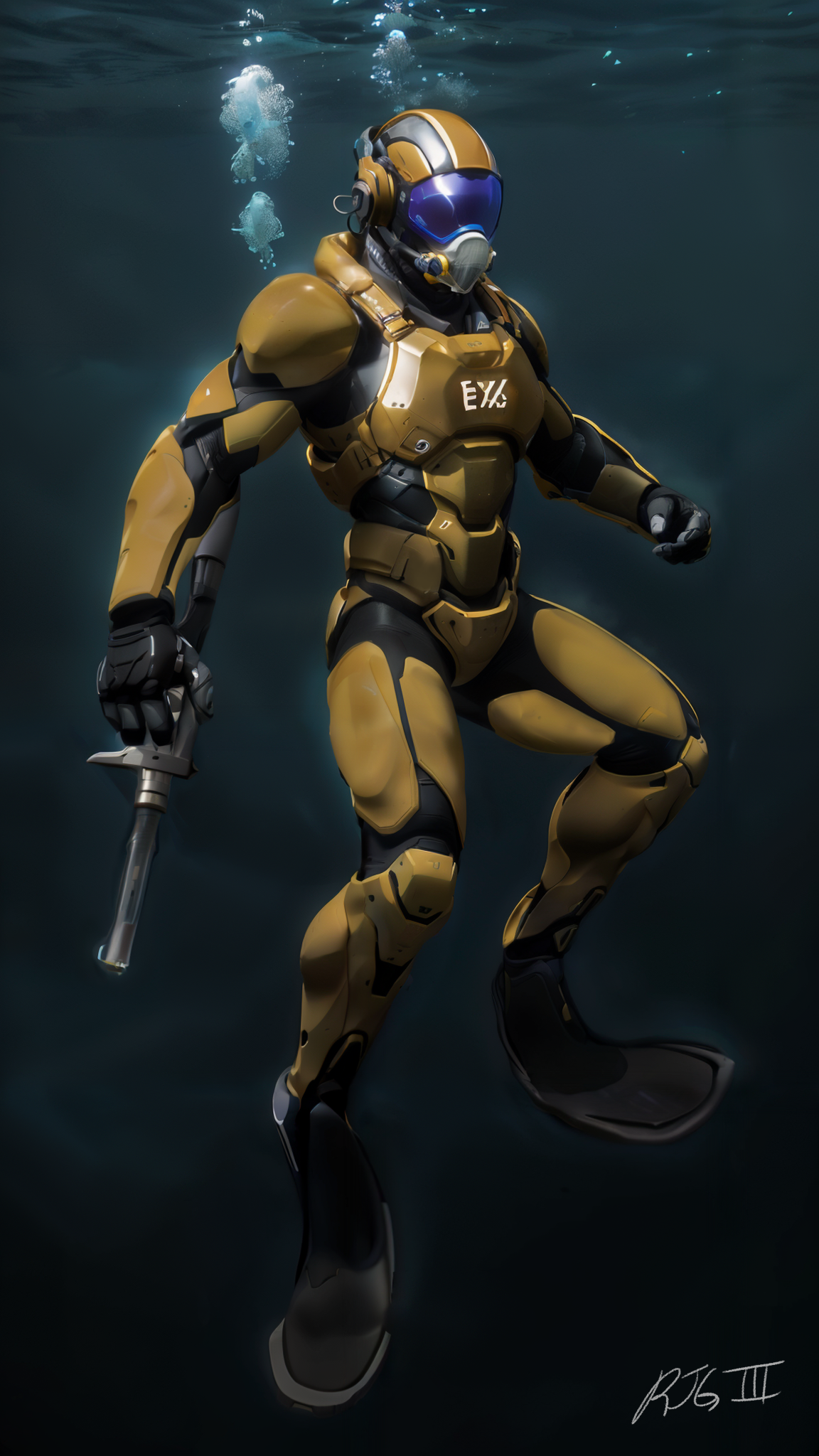 An A.I. enhanced image of some previously created original concept art of a submarine, underwater, trooper.